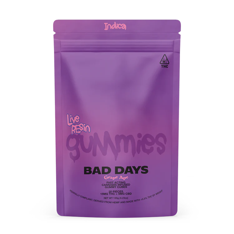 Grape Ape Live Resin Gummies deliver rich grape flavor paired with a relaxing indica-style experience. Each gummy contains 15mg THC and 5mg CBD, creating a balanced effect designed to relax the body while maintaining a mellow, euphoric mood. The live resin infusion preserves natural terpenes for deeper flavor and a smoother edible experience.