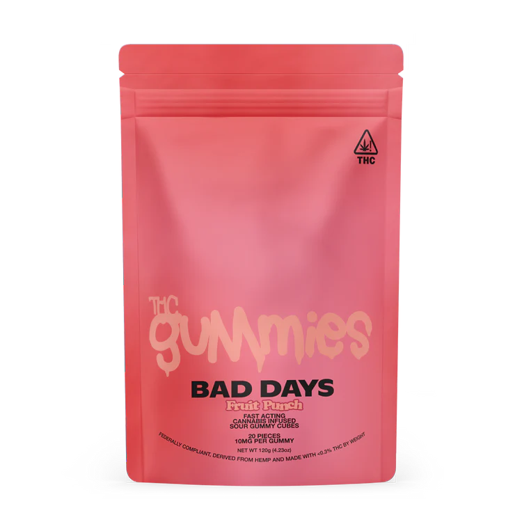 Fruit Punch Gummies offer a lighter, approachable edible option with sweet mixed-fruit flavor. These gummies feature a 10mg THC dose, making them a great choice for those seeking a more moderate experience while still enjoying the classic Bad Days flavor profile.